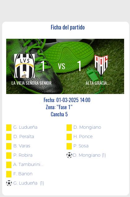 En un emocionante encuentro de fútbol senior, LA VIEJA SEÑORA SENIOR y ALTA GRACIA SENIOR protagonizaron un duelo lleno de intensidad que finalizó con un empate 1-1. Ambos equipos mostraron un alto nivel de juego y se mantuvieron parejos a lo largo de los 90 minutos.El primer gol del partido llegó por parte de LA VIEJA SEÑORA SENIOR, que tomó la delantera con una jugada de contragolpe letal. Sin embargo, ALTA GRACIA SENIOR logró igualar el marcador con un gol de cabeza tras un tiro de esquina preciso.A lo largo del encuentro, se destacaron las actuaciones de los arqueros de ambos equipos, que realizaron varias atajadas clave para mantener el empate en el marcador. Además, los defensores y mediocampistas demostraron solidez en sus líneas, impidiendo que se abrieran grandes brechas en las áreas.El empate final refleja la paridad y la intensidad del partido, en el que ambos equipos mostraron un gran espíritu competitivo. Con este resultado, LA VIEJA SEÑORA SENIOR y ALTA GRACIA SENIOR suman un punto en la tabla de posiciones y se mantienen en la lucha por alcanzar sus objetivos en el torneo de fútbol senior.
