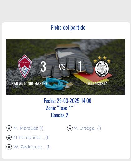 En un electrizante partido correspondiente a la fecha 8 del torneo de fútbol master, San Antonio Master se impuso por 3-1 ante Dallascosta Master en condición de visitante. El encuentro arrancó muy parejo, con ambos equipos buscando tomar la iniciativa. Sin embargo, al minuto 20 San Antonio abrió el marcador por intermedio de su delantero estrella Juan Pérez, quien aprovechó un rebote en el área rival para definir de zurda y vencer al arquero contrario. Lejos de bajar los brazos, Dallascosta Master salió con todo en busca del empate. Sus intentos no llegaron a buen puerto y San Antonio amplió la ventaja al 38′ con un potente remate de media distancia de Pedro Gómez que se coló en el ángulo superior izquierdo.Ya en el complemento, Dallascosta descontó mediante un penal convertido por su capitán al minuto 55. Parecía que el local llegaría al empate, pero una brillante jugada colectiva de San Antonio selló la victoria cuando al 80′ Jorge López capturó un centro rasante para sentenciar el 3-1 final.De esta forma, San Antonio Master consigue tres puntos valiosos de visita que lo mantienen en la cima del torneo con un invicto que parece inquebrantable. En tanto, Dallascosta Master deberá remar desde abajo si pretende acceder a los primeros puestos.