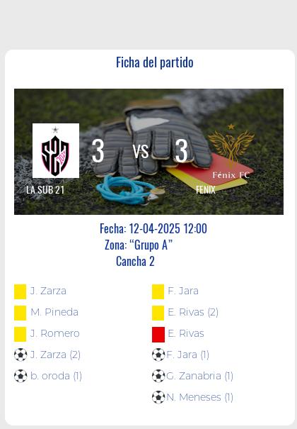 En un emocionante partido que terminó con un empate 3-3, LA SUB 21 y FENIX se repartieron puntos luego de un encuentro con alternativas para ambos equipos. El local LA SUB 21 comenzó ganando con un gol a los 10′ tras una buena jugada colectiva que definió su delantero estrella. Sin embargo, FENIX reaccionó y logró dar vuelta el marcador aún en el primer tiempo con dos goles, uno de cabeza en un tiro de esquina y otro tras un error en la salida del arquero rival. En el complemento, LA SUB 21 salió decidido a buscar el empate y lo consiguió promediando la etapa con un potente remate desde fuera del área. Sobre el final, cuando parecía que el encuentro terminaba con un agónico triunfo visitante, LA SUB 21 arrancó una última ofensiva y llegó al empate definitivo a los 89′, desatando la alegría del público local.Con este resultado, ambos sumaron un punto que refleja la igualdad de las acciones y el buen juego desplegado por los dos equipos durante los 90 minutos.