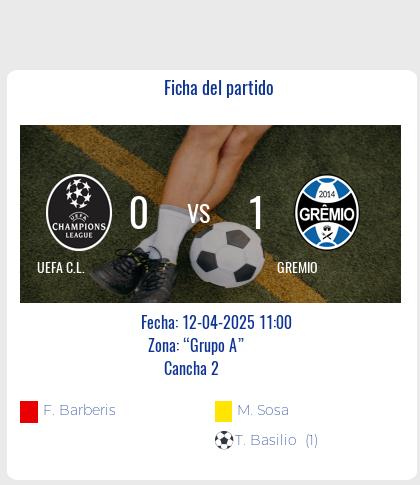 El partido de la fecha 5 de la UEFA Champions League entre el UEFA C.L. y GREMIO finalizó con un resultado de 0-1 a favor del equipo visitante. El único gol del partido llegó al minuto 79′ por parte del delantero estrella de GREMIO tras una gran jugada individual dentro del área. Eludió a dos defensores y definió cruzado de zurda, venciendo al arquero rival.Fue un encuentro muy disputado de principio a fin, con llegadas de peligro para ambos equipos. Sin embargo, la defensa del UEFA C.L. no pudo contener el talentoso ataque de GREMIO. En los minutos finales, el UEFA C.L. buscó de manera desesperada el empate pero no pudo concretar. GREMIO administró bien la ventaja y se llevó una valiosa victoria de visitante por 0-1, sin que se diera ningún empate en el marcador.
