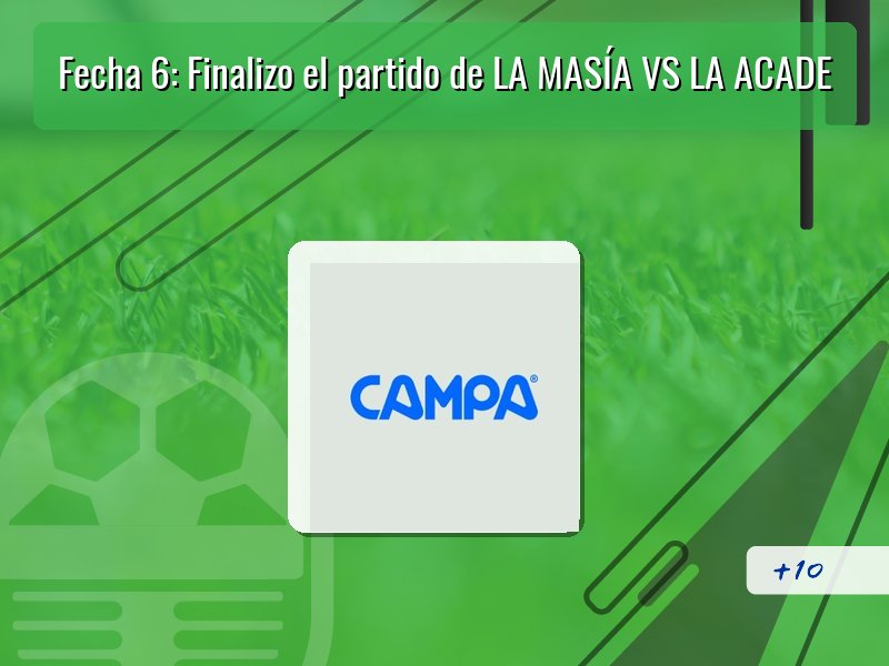 En el segundo tiempo, La Masía volvió a ponerse en ventaja con un brillante gol de Pablo luego de una gran jugada colectiva al minuto 60. Cuando parecía que el partido estaba definido, La Academia sorprendió con el empate a dos goles en una jugada a balón parado al minuto 80.