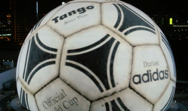 La marca alemana se adueñó nada menos que del Sphere de Las Vegas, la pantalla más grande del planeta, para mostrar una línea de tiempo inolvidable: los balones icónicos de cada Copa Mundial. Desde el Tango España ’82 hasta el Brazuca de Brasil 2014 y el Al Rihla de Qatar 2022, todos desfilaron en una exhibición impresionante.